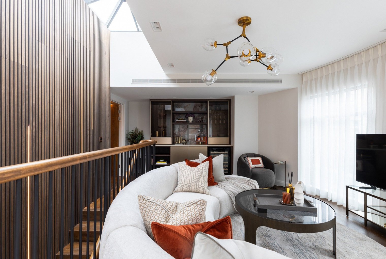 This three-storey penthouse apartment was designed as a sanctuary—an escape from the energy of Central London. While intrinsically connected to a prestigious hotel, the interiors were crafted to feel grounded and deeply comfortable, offering an atmosphere of warmth and home. The result is a private retreat where calm, earthiness, and understated luxury create a true sense of escapism